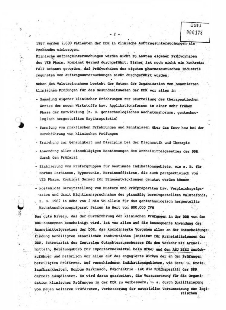Dieser Auszug aus einer Stasiakte zu den Medikamententests für westliche Pharmafirmen Ende der 1980er Jahre beschreibt wesentliche Details zu diesen Studien, Quelle: BArch, MfS, HA XX, Nr. 6869, Bd. 1, Bl. 178.