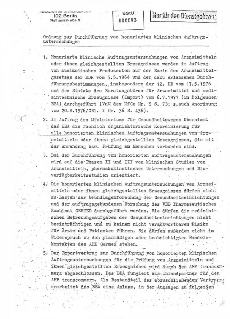 Ordnung zur Durchführung von sog. honorierten klinischen Auftragsuntersuchungen – gemeint waren damit die Medikamentenstudien für westliche Pharmahersteller. Diese Ordnung baute auf das Arzneimittelgesetz und weitere Durchführungsrichtlinien der DDR auf, Quelle: BArch, MfS, HA XX, Nr. 7244 Bd. 1, Bl. 83.