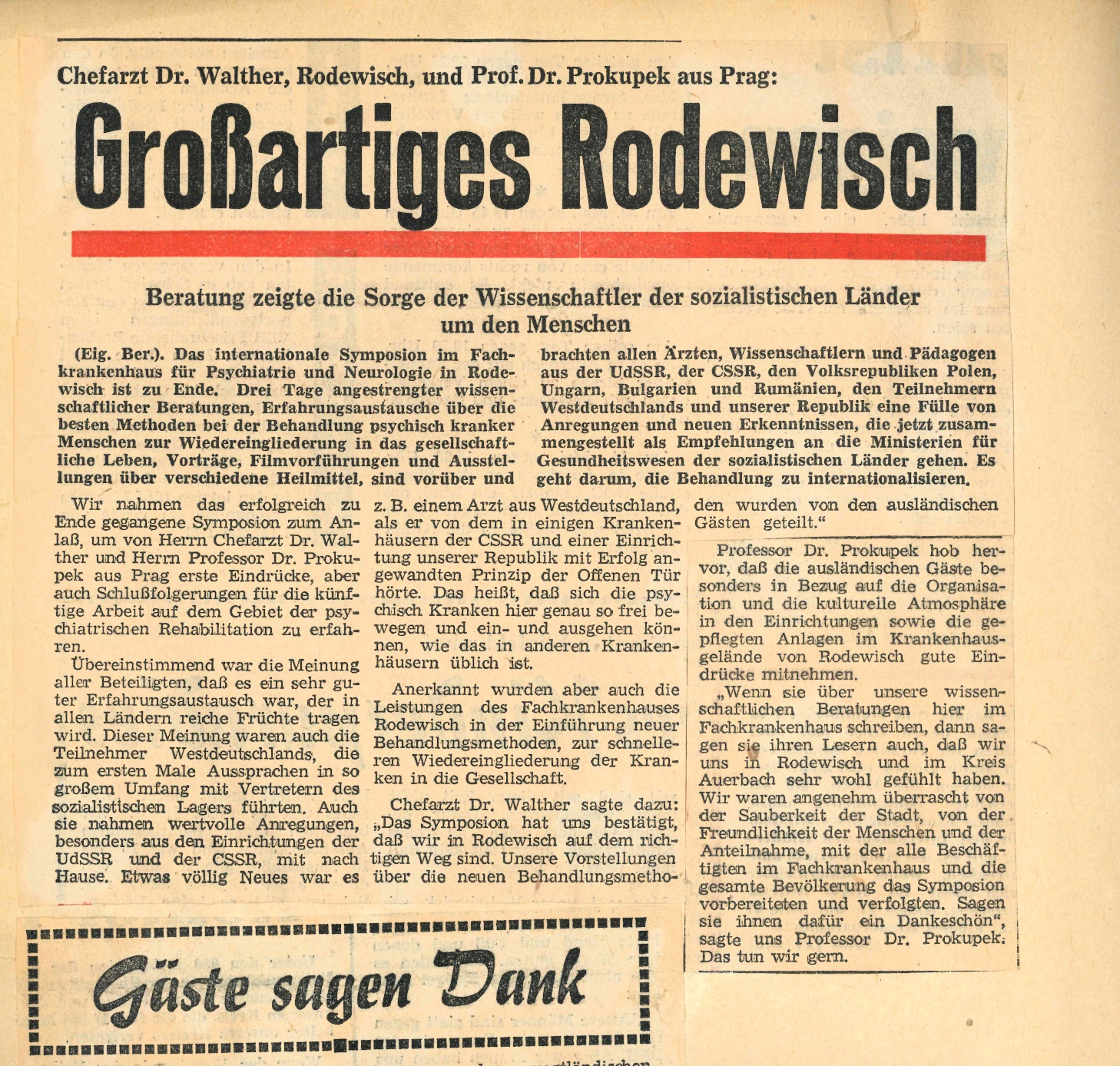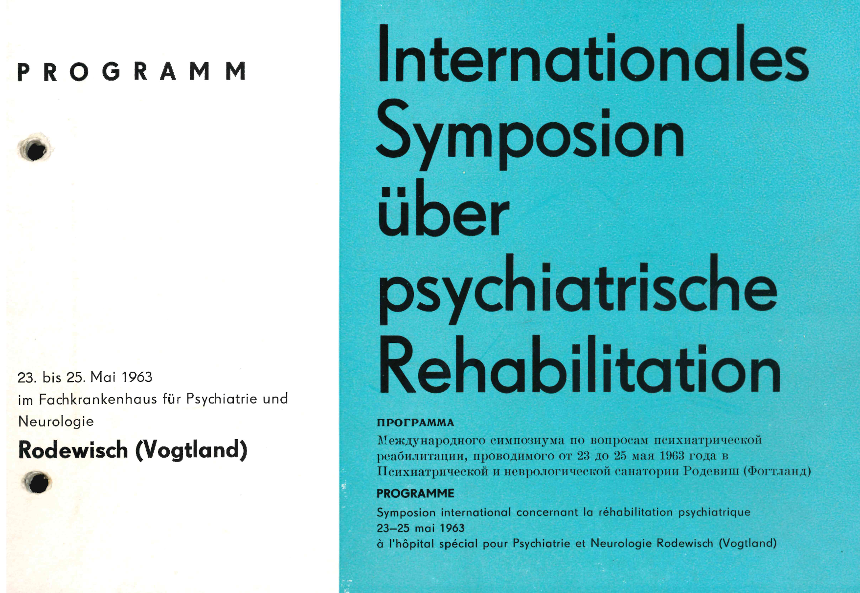 Vom 23. bis 25. Mai 1963 fand im sächsischen Rodewisch das erste Internationale Symposium zur psychiatrischen Rehabilitation statt – ein bedeutendes Ereignis in der Reformbewegung der ostdeutschen Psychiatrie. Die Veranstaltung wurde von der Gesellschaft für Rehabilitation in der Gesellschaft für Hygiene, der Sektion für psychiatrisch-neurologische Rehabilitation der Gesellschaft für Psychiatrie und Neurologie der DDR sowie den Ministerien für Gesundheitswesen der DDR und der ČSSR organisiert.
