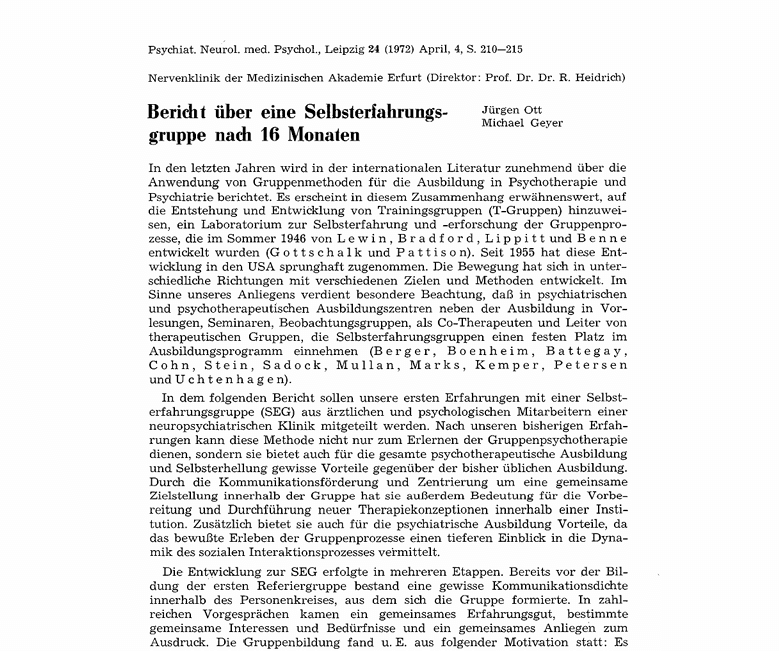 Geyer, M. (2011). Die Erfurter Selbsterfahrungsgruppe und ihr Einfluss auf die Psychotherapie der DDR. In M. Geyer (Hrsg.), Psychotherapie in Ostdeutschland: Geschichte und Geschichten 1945–1995, S.203-214. Göttingen: Vandenhoeck & Ruprecht.