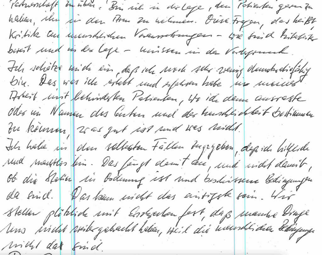 Auseinandersetzung einer Pflegerin mit der Situation der täglichen Überforderung im Behindertenbereich und dem Hinterfragen, inwieweit der Umgang ein menschlicher, demokratischer ist: „Bin ich in der Lage, den Patienten gern zu haben, ihn in den Arm zu nehmen […] Ich habe in den seltesten Fällen zugegeben, daß ich hilflich [hilflos] und machtlos bin. Das fängt damit an, und nicht damit, ob die Station in Ordnung ist und beschissene Bedingungen da sind. […] Wir stellen plötzlich mit Erschrecken fest, daß manche Dinge uns nicht weitergebracht haben, weil die menschlichen Bedingungen nicht da sind. […] In unserem Interesse liegt es, wie wir als Mitstreiter mit dem Nachbar [!] anfangen zu sprechen. Wir müssen das machen als Mitbetroffene […].“ (Juni 1989)