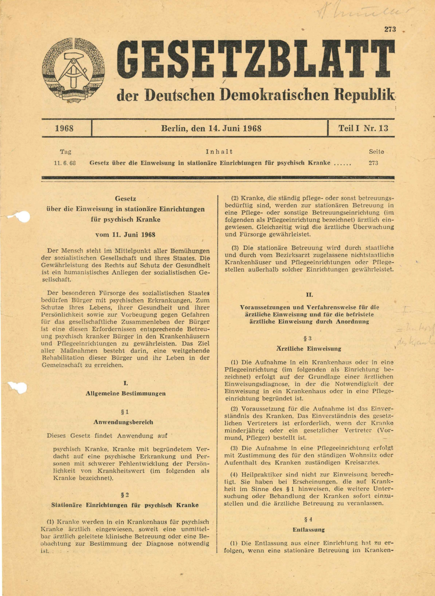 Gesetzblatt der Deutschen Demokratischen Republik: Gesetz über die Einweisung in stationäre Einrichtungen für psychisch Kranke, 14.06.1968, S. 273.