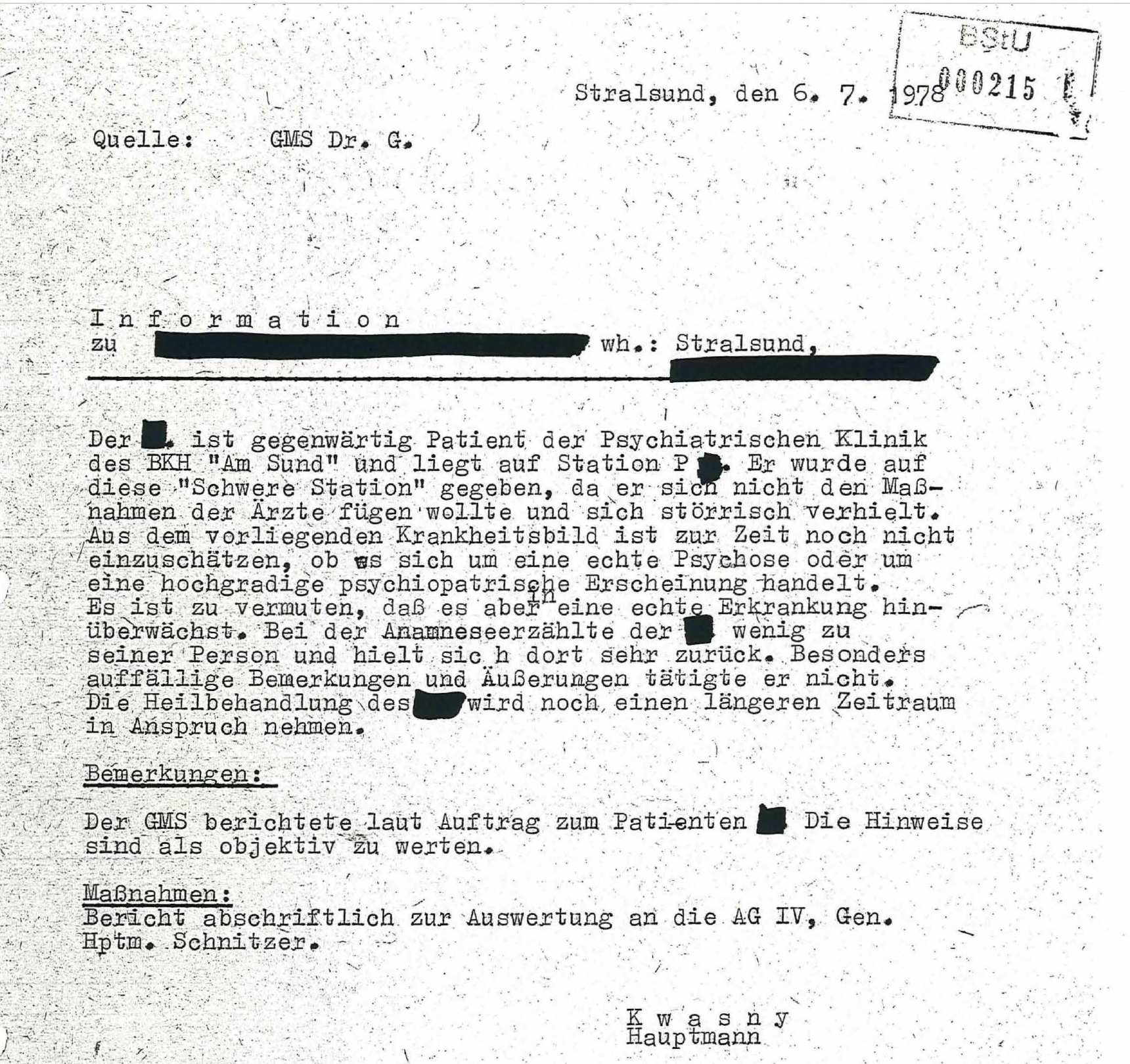 Der Direktor der Einrichtung, Horst Giermann (GMS „Horst“), übermittelte dem MfS-Hauptmann Kwasny Informationen über einen Patienten. Zweck war es, eine mögliche Simulation auszuschließen und zugleich Erkenntnisse für mögliche operative Maßnahmen zu gewinnen.