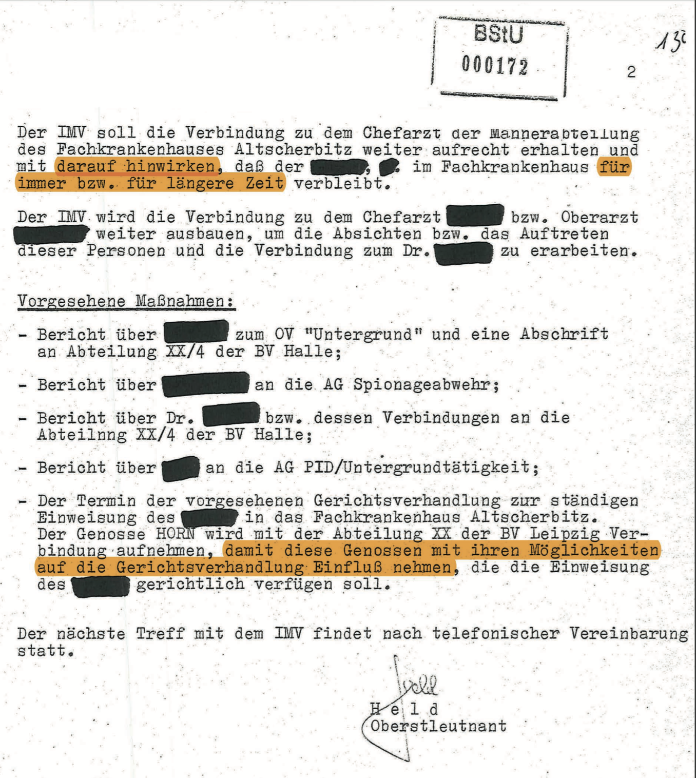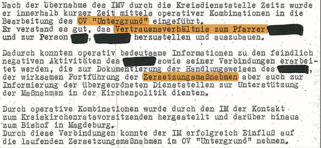 Involviert war auch die Kreisärztin. Dennoch gelang eine langfristige Einweisung in die Psychiatrie nicht. Aber: Mittels gezielter operativer Maßnahmen wurde durch den IMS der Kontakt zum Kreiskirchenratsvorsitzenden hergestellt und zudem eine Verbindung zum Bischof in Magdeburg aufgebaut. Über diese Verbindungen konnte der IMS wirksam Einfluss auf die laufenden Zersetzungsmaßnahmen ausüben. In der Folge wurde Pfarrer M. versetzt und ein Stück weit mundtot gemacht.