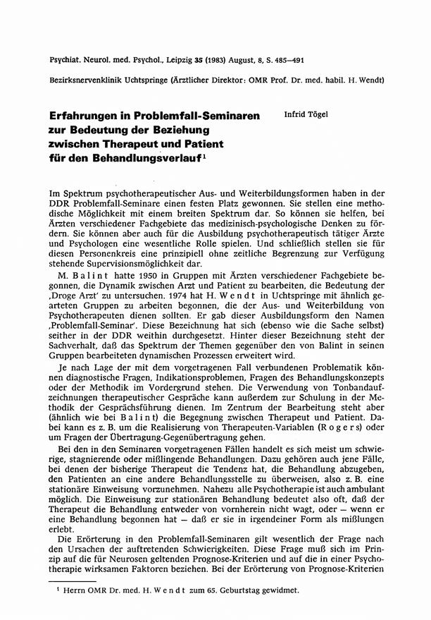 1973 wird unter Harro Wendt in Uchtspringe das erste Problemfallseminar (in Anlehnung an die westdeutschen Balint-Gruppen) durchgeführt. In diesem Rahmen können seither vorwiegend jüngere, psychotherapeutisch interessierte, aber relativ unerfahrene Ärzte und Psychologen bei problematischen Behandlungsfällen Beratung und Supervision von erfahrenen Kollegen bekommen. Die Seminare haben dabei eine stark leitungszentrierte Herangehensweise: ein erfahrener Psychotherapeut eröffnet durch Hinweise, Erläuterungen und Ratschläge neue Sichtweisen bei der Behandlung schwieriger Fälle, beantwortet Fragen und schult somit das psychosoziale Denken und Handeln der Zuhörerschaft.