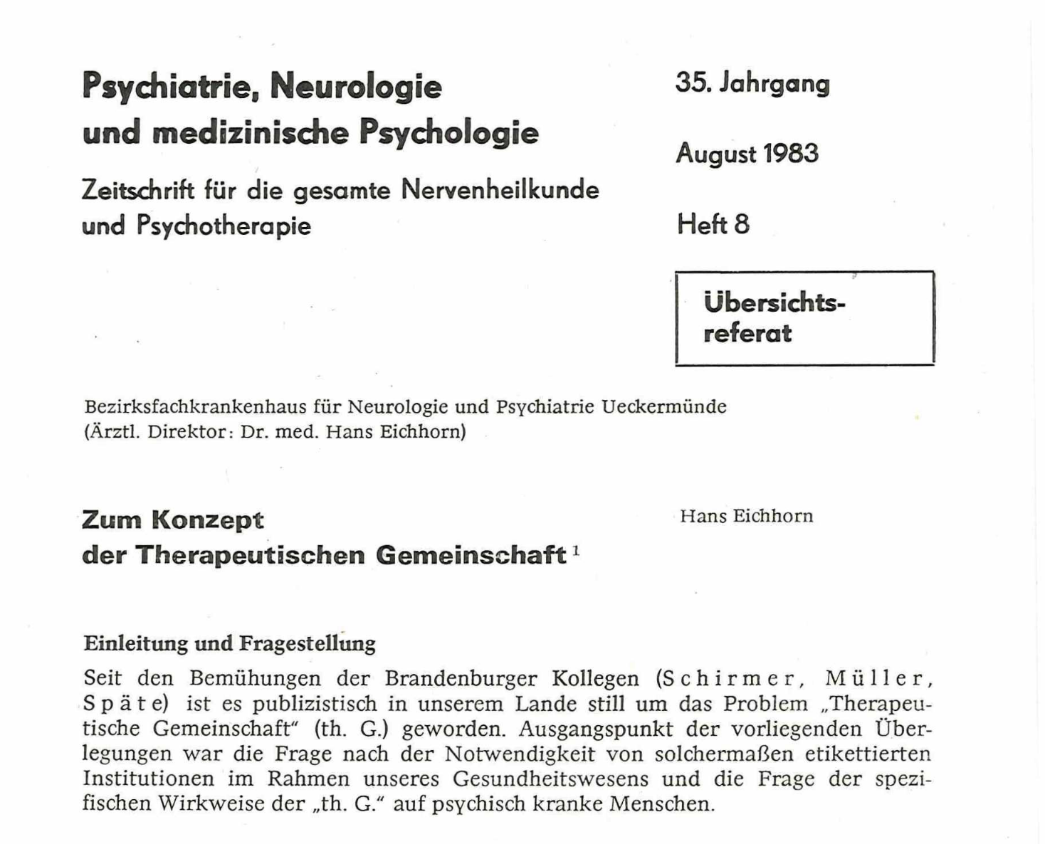 Hans Eichhorn: Institutionelle Voraussetzungen für die Integration von Psychotherapie in die Psychiatrie, in: Eichhorn, Hans; Ernst, Klaus (Hg.): Arbeitsmaterialien des Symposiums «Erfahrungen und Ergebnisse der Psychotherapie in der Psychiatrie», Ueckermünde 1985, S. 80–91, hier S. 84.