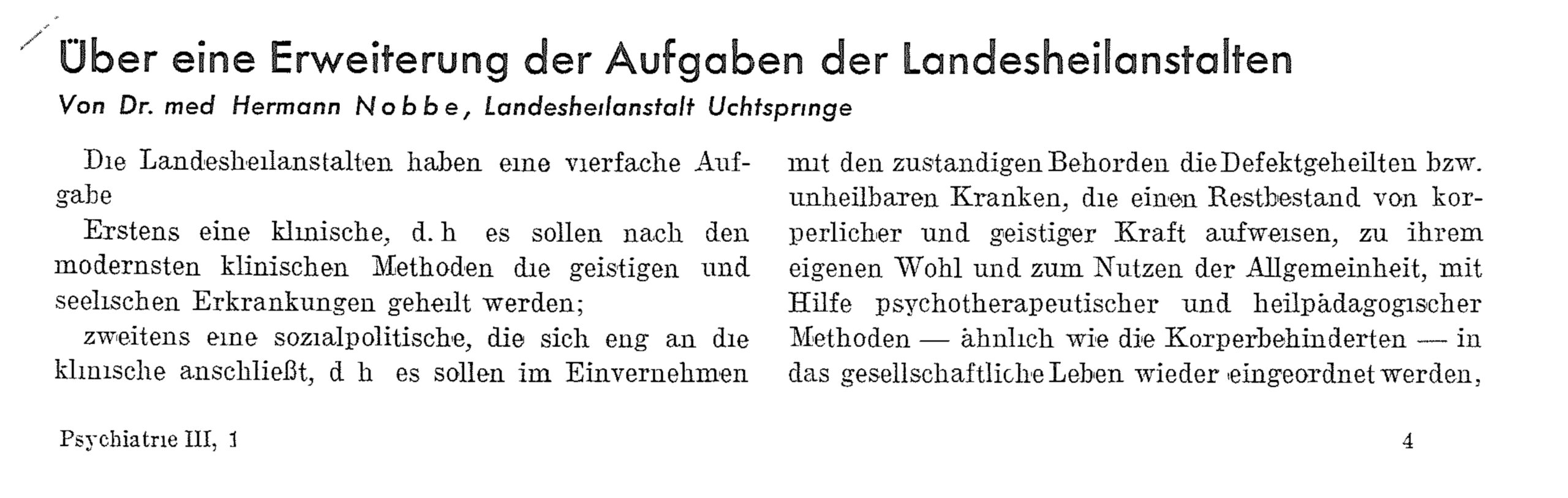 Nobbe, Hermann: Über eine Erweiterung der Aufgaben der Landesheilanstalten, in: Psychiatrie, Neurologie und medizinische Psychologie 1951; 3 (1), S. 25–28.