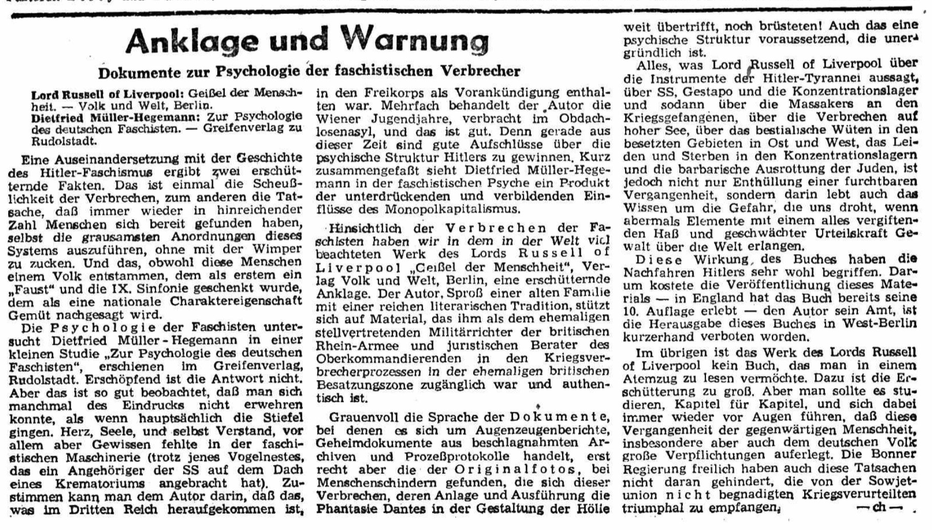 Müller-Hegemann, Dietfried: Zur Psychologie des deutschen Faschisten, Rudolstadt 1955.
