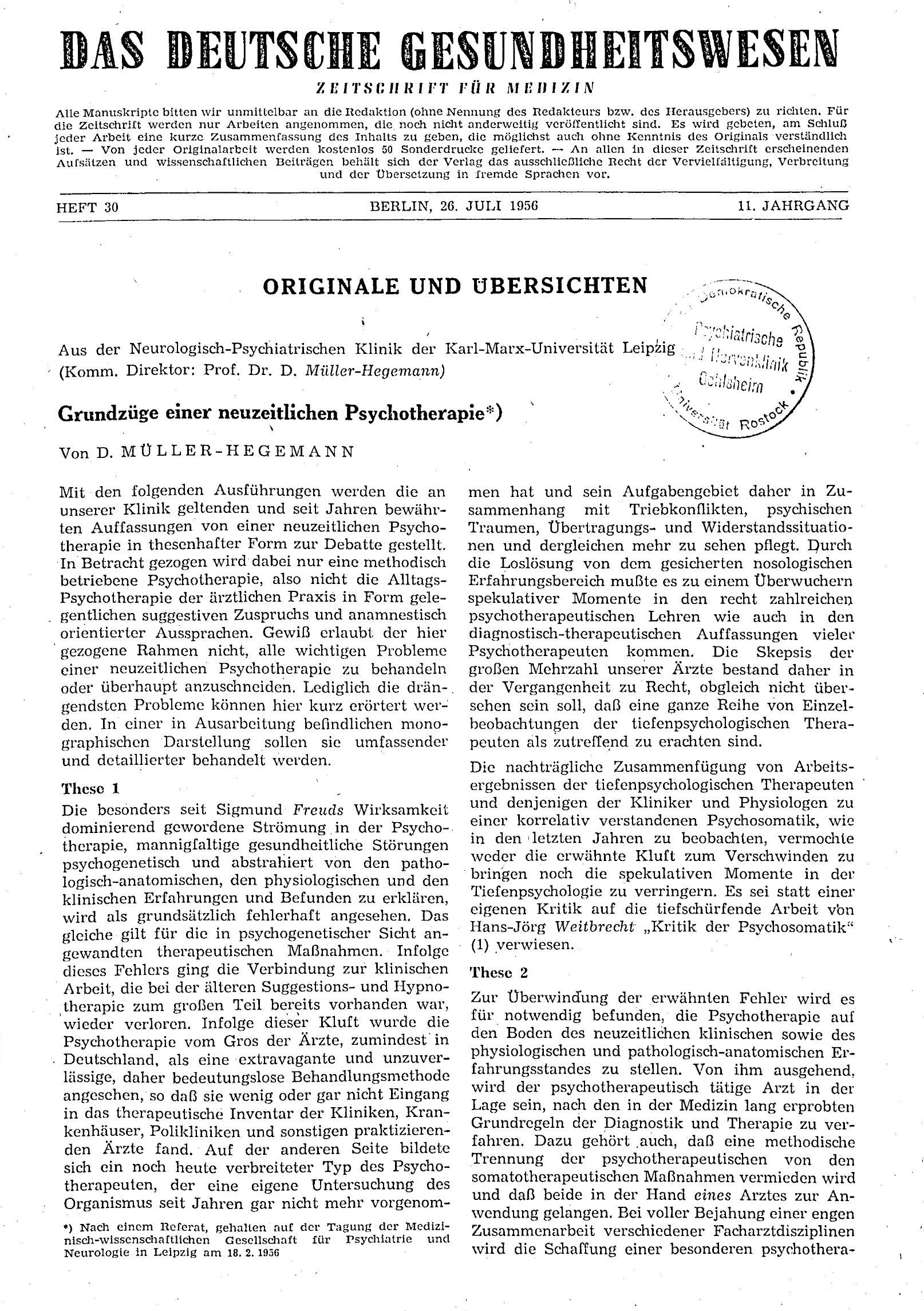 Müller-Hegemann, Dietfried: Zwei Wege in die moderne Psychotherapie, in: Das Deutsche Gesundheitswesen 6 (23), 1951, S. 641–646.