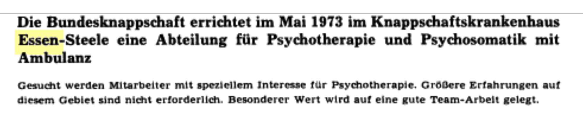 1973–1975Aufbau und Leitung einer Psychotherapieabteilung am Knappschaftskrankenhaus Essen-Steele