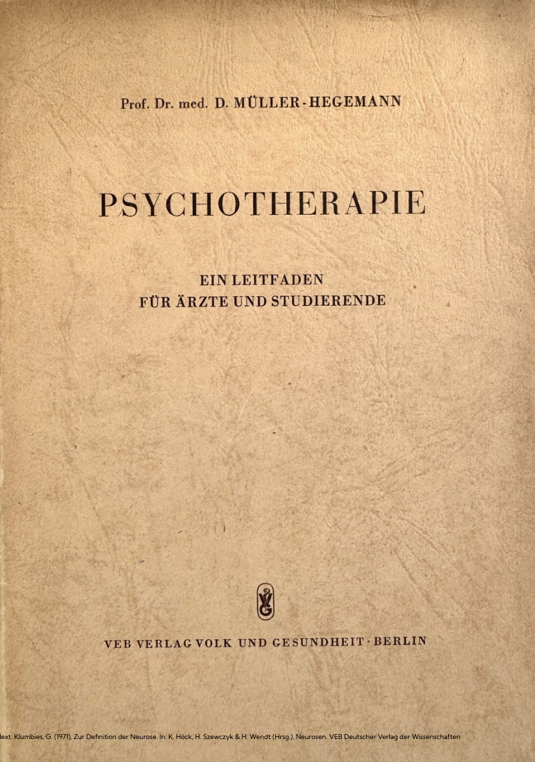 Müller-Hegemann, Dietfried: Psychotherapie. Ein Leitfaden für Ärzte und Studierende Verlag Volk und Gesundheit, Berlin 1957.
