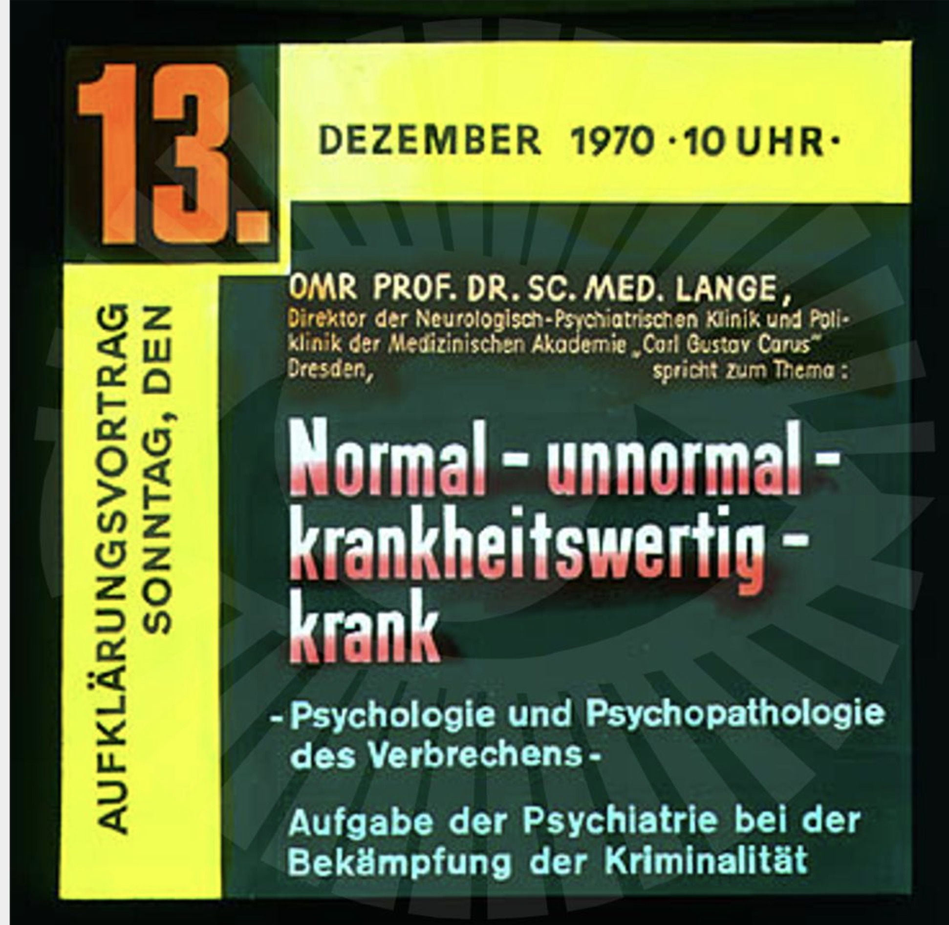 Plakat für den Aufklärungsvortrag von Ehrig Lange im Jahr 1970 zum Thema „Normal – unnormal – krankheitswertig – krank – Psychologie und Psychopathologie des Verbrechens – Aufgabe der Psychiatrie bei der Bekämpfung der Kriminalität“, Quelle: Deutsches Hygiene-Museum 2002/2308.