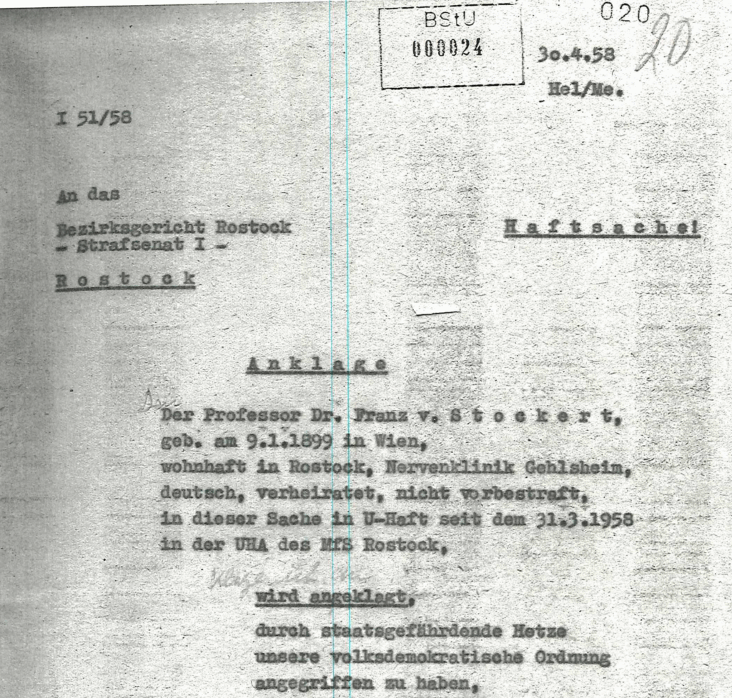 Franz Günther Ritter von Stockert war ein international bekannter Psychiater mit starker wissenschaftlicher Prägung und familiären Beziehungen zu bedeutenden Neurologen und Psychiatern. 1954 nahm er den Ruf auf den Lehrstuhl für Psychiatrie und Neurologie an der Universität Rostock an und leitete die Universitäts‑Nervenklinik Rostock‑Gehlsheim. Der sozialistischen Gesellschaftsordnung stand er skeptisch gegenüber. Seine Karriere in der DDR war dementsprechend nur von kurzer Dauer.