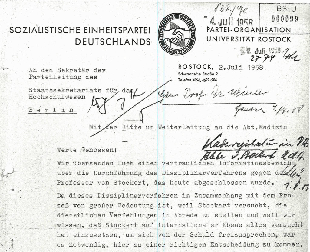 Der Rostocker Lehrstuhl für Psychiatrie und Neurologie wurde gezielt aufgeteilt, um den Einfluss von von Stockert zu begrenzen. Ziel war, den Machtbereich des Wissenschaftlers einzuschränken, was durch eine zentrale Entscheidung in Berlin umgesetzt wurde, gegen den Widerstand der Medizinischen Fakultät. Die Hochschulpolitik wurde von Berlin strikt gesteuert, wobei kritische Stimmen der Fakultäten weitgehend ignoriert wurden. Die Abspaltung des Lehrstuhls in mehrere eigenständige Fachbereiche sollte den Einfluss Stockerts reduzieren. Trotz dieser Maßnahmen blieb die DDR in Bezug auf wissenschaftliche Autonomie und Qualität der Fachrichtungen unter Druck, da der ideologische Einfluss und der Mangel an qualifiziertem Personal die Entwicklung hemmten. Viele hochqualifizierte Mediziner und Wissenschaftler, darunter auch Franz Günther von Stockert, verließen zwischen 1949 und 1961 systematisch die DDR, um im Westen bessere Perspektiven zu finden. Dies spiegelte die anhaltenden Spannungen zwischen politischer Kontrolle und wissenschaftlicher Freiheit innerhalb des DDR-Hochschulsystems wider.