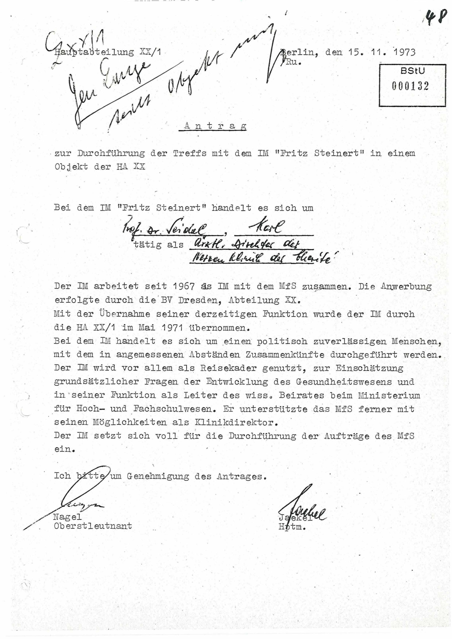 Auszug aus der MfS-Spitzelakte von Karl Seidel aus dem Jahr 1973. Seidel wurde als leitender Arzt in Dresden angeworben und später von den Genossen in Berlin übernommen. Bis 1989 hatte Seidel nachweislich umfangreiche Kontakte zur Staatssicherheit. Die Berichte zu den Treffs mit dem Abteilungsleiter der zuständigen Hauptabteilung XX, dem MfS-Offizier Eberhard Jaekel, geben ein gutes Abbild der Gesundheitspolitik der DDR in den 1980er Jahren. Im Herbst 1989 geriet Seidel selbst ins Visier des MfS wegen des Verdachts der Korruption. Das MfS sammelte umfangreich Beweismaterial wegen des Verdachts, dass Seidel während seiner Amtszeit als ZK-Abteilungsleiter u.a. Computer aus dem Westen einschmuggelte, um sie in der DDR zu verkaufen. (BArch, MfS, Sonderablage Leiter, 13788/83 ASB, Bd. 1, Bl. 132 /Erices)